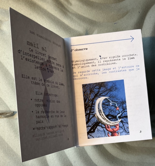 Vav est le symbole du lien, thème de ce livret. Dans les textes sacrés, elle est reliée à d’autres lettres pour créer du sens entre 2 mots, 2 phrases, 2 idées, 2 temps de la vie.